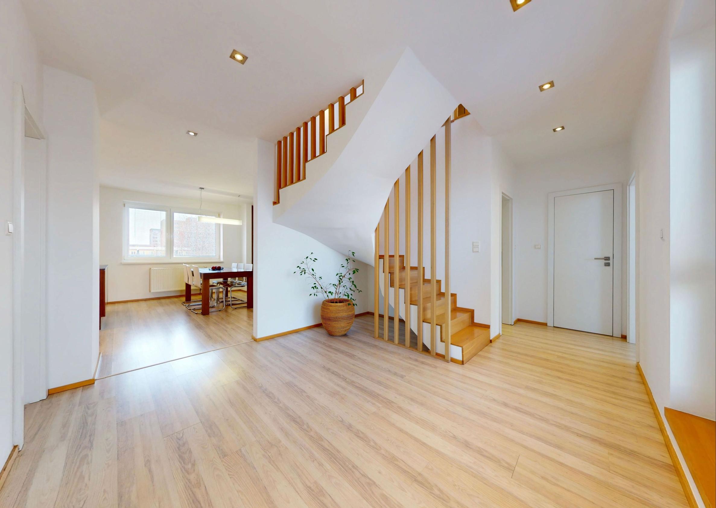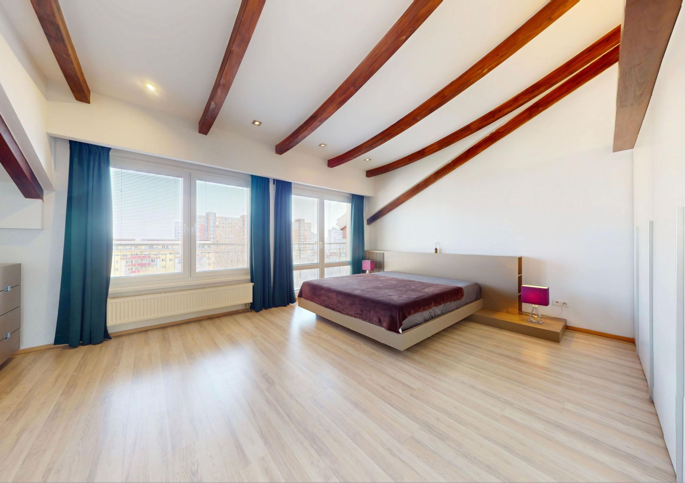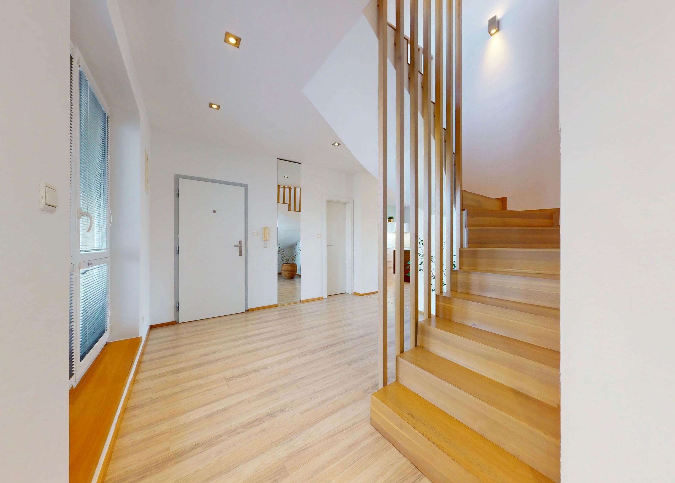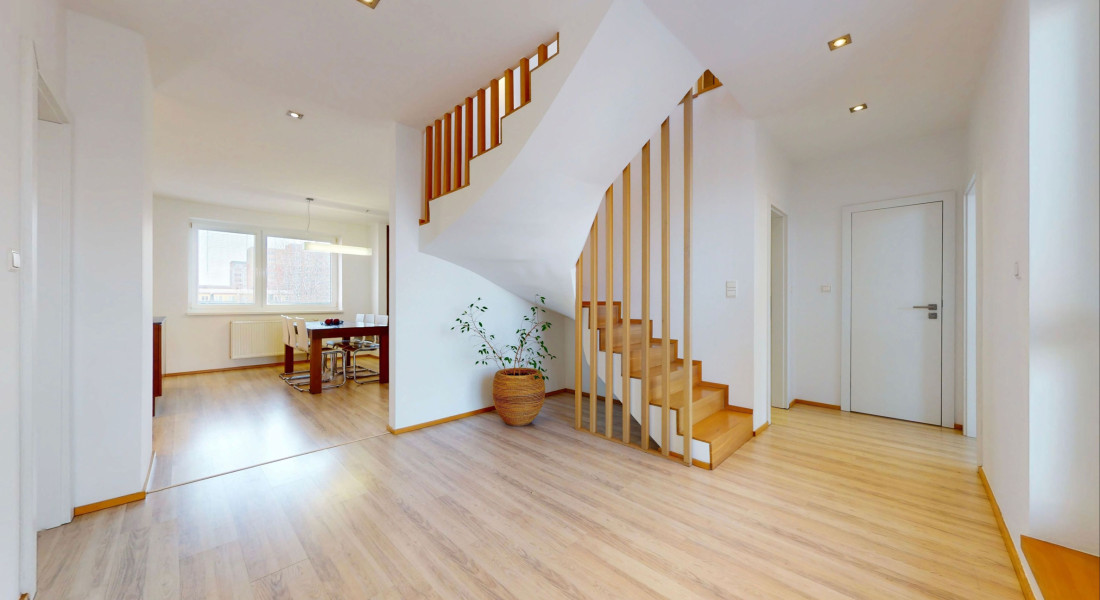 Ponúkame na predaj priestranný a presvetlený 5-izbový mezonet v staršej novostavbe s výbornou dispozíciou v atraktívnej lokalite na začiatku Petržalky. Byt sa nachádza na 7. a 8. poschodí a ponúka krásne výhľady – na severozápadnej strane na panorámu Bratislavy a na juhovýchodnej strane na udržiavaný park v tichej lokalite.
