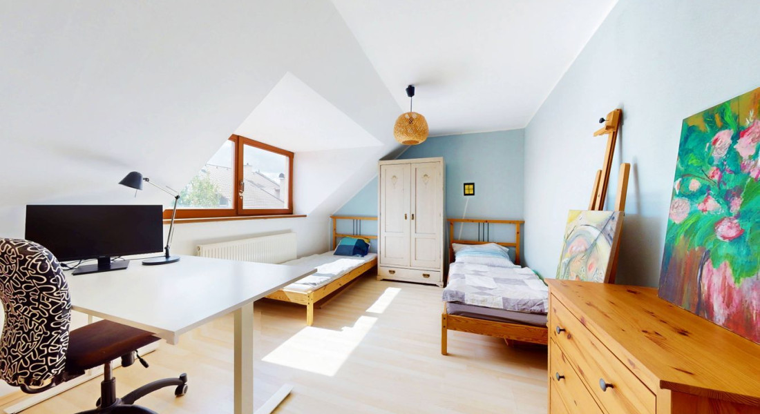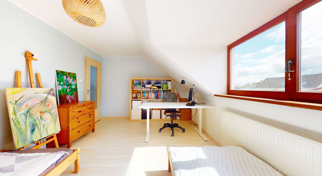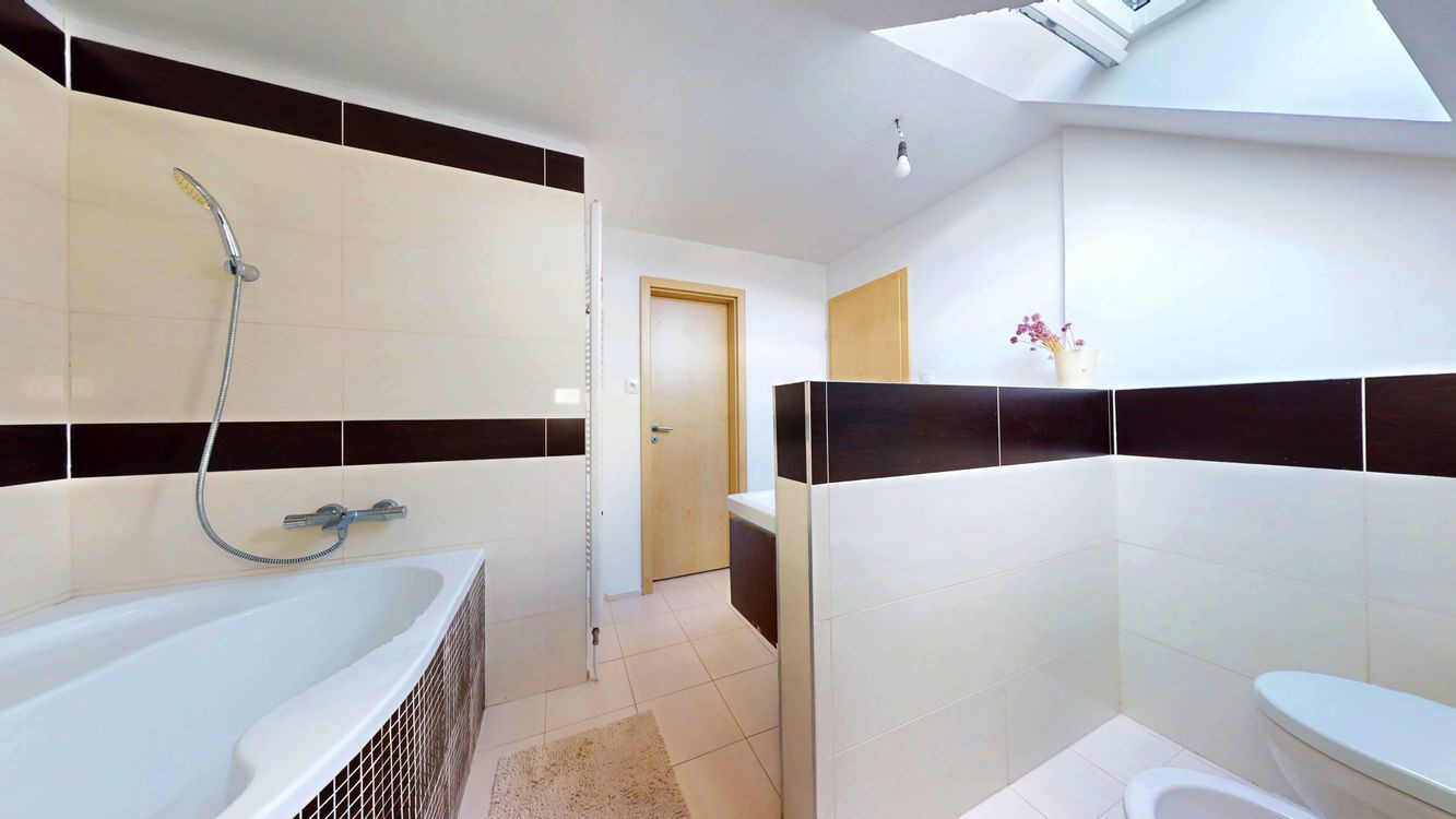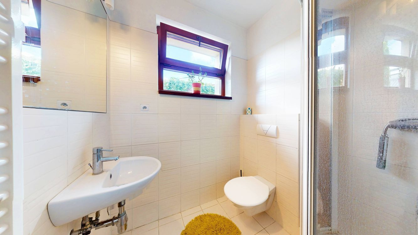 Poschodie: 3 plnohodnotné izby, kúpeľňa s rohovou vaňou, WC a pračkou.