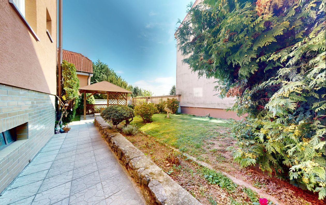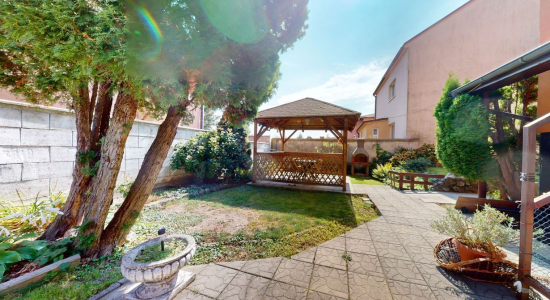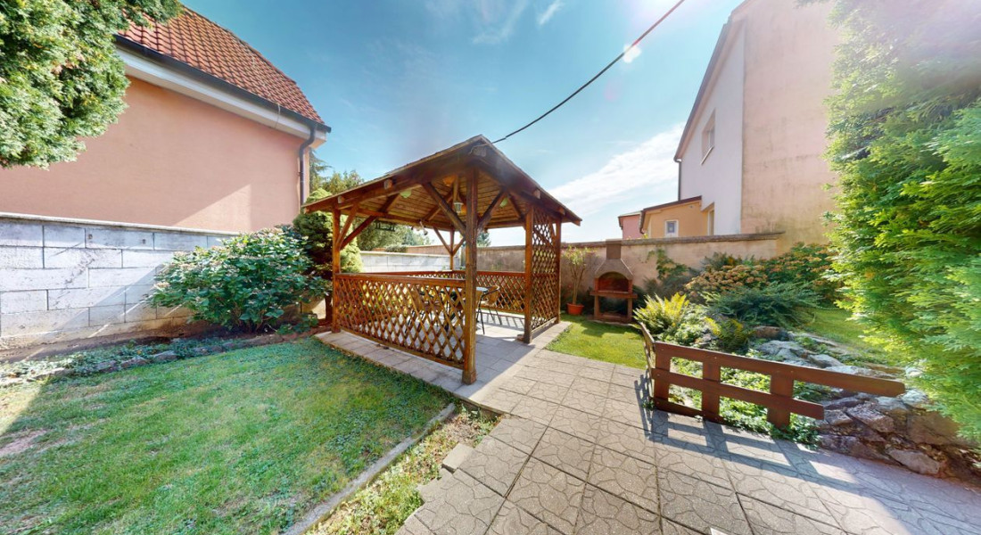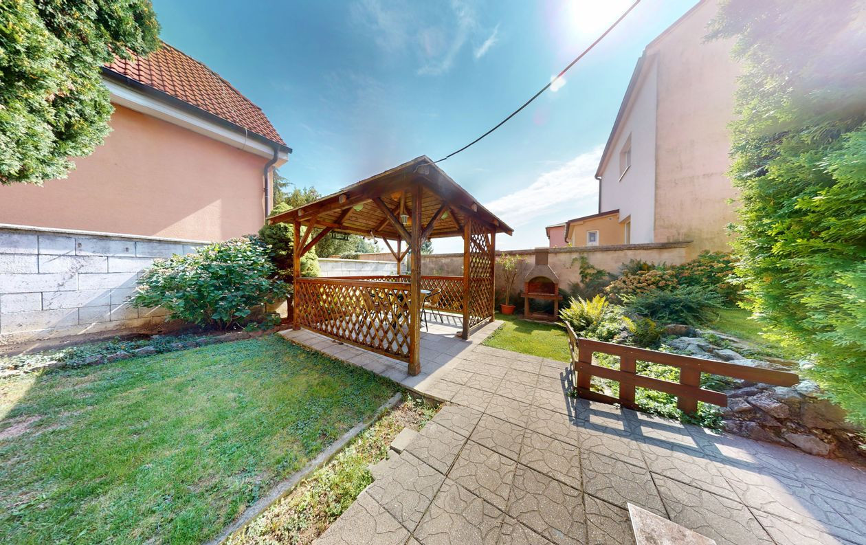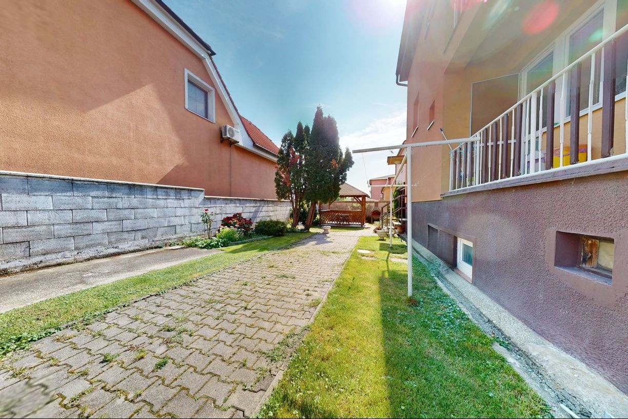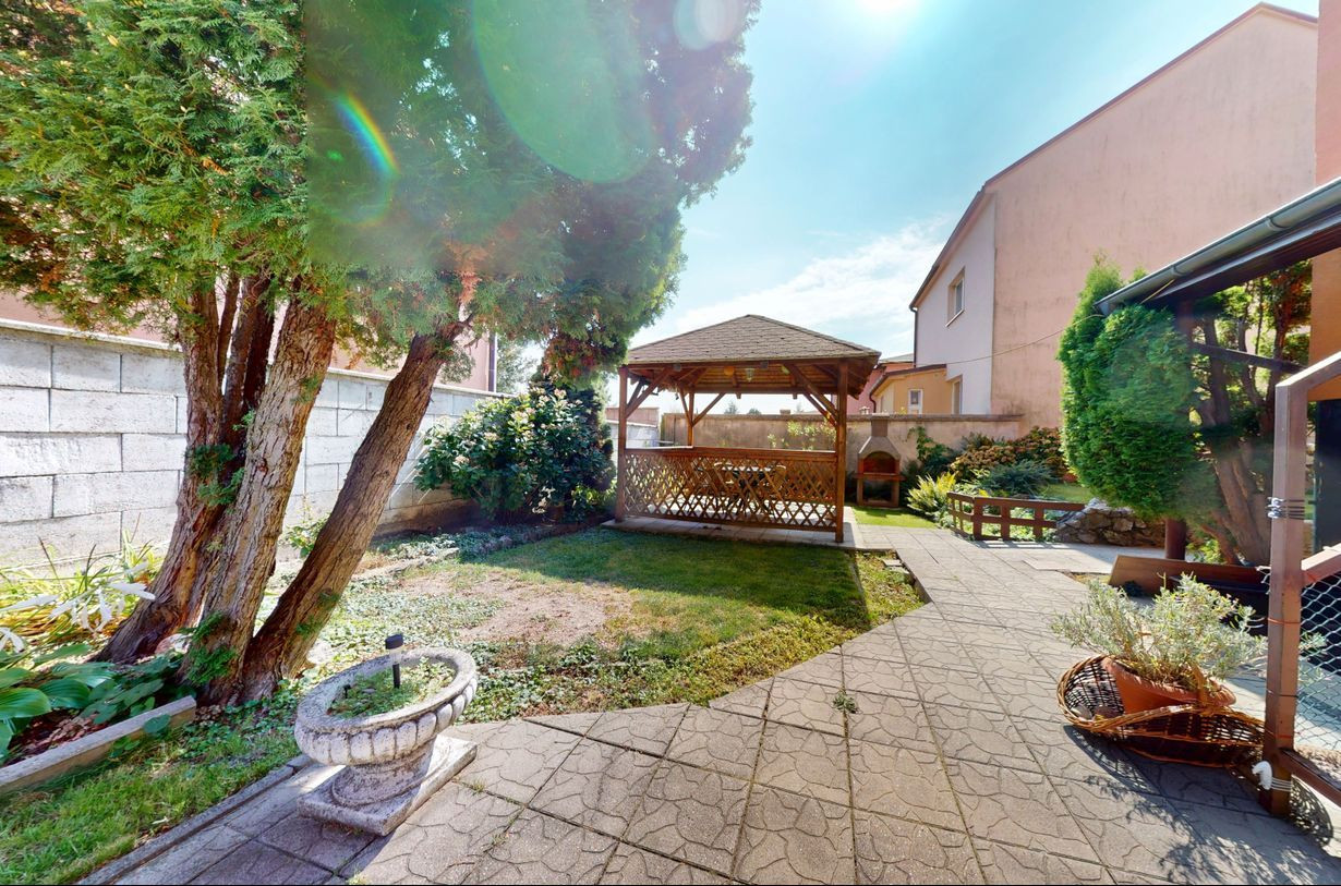 Dom je postavený na pozemku s výmerou 390 m². Na pozemku vysadené okrasné dreviny, kríky a kvety. Altánok dotvára peknú atmosféru na pozemku. Možnosť parkovať auto na pozemku.