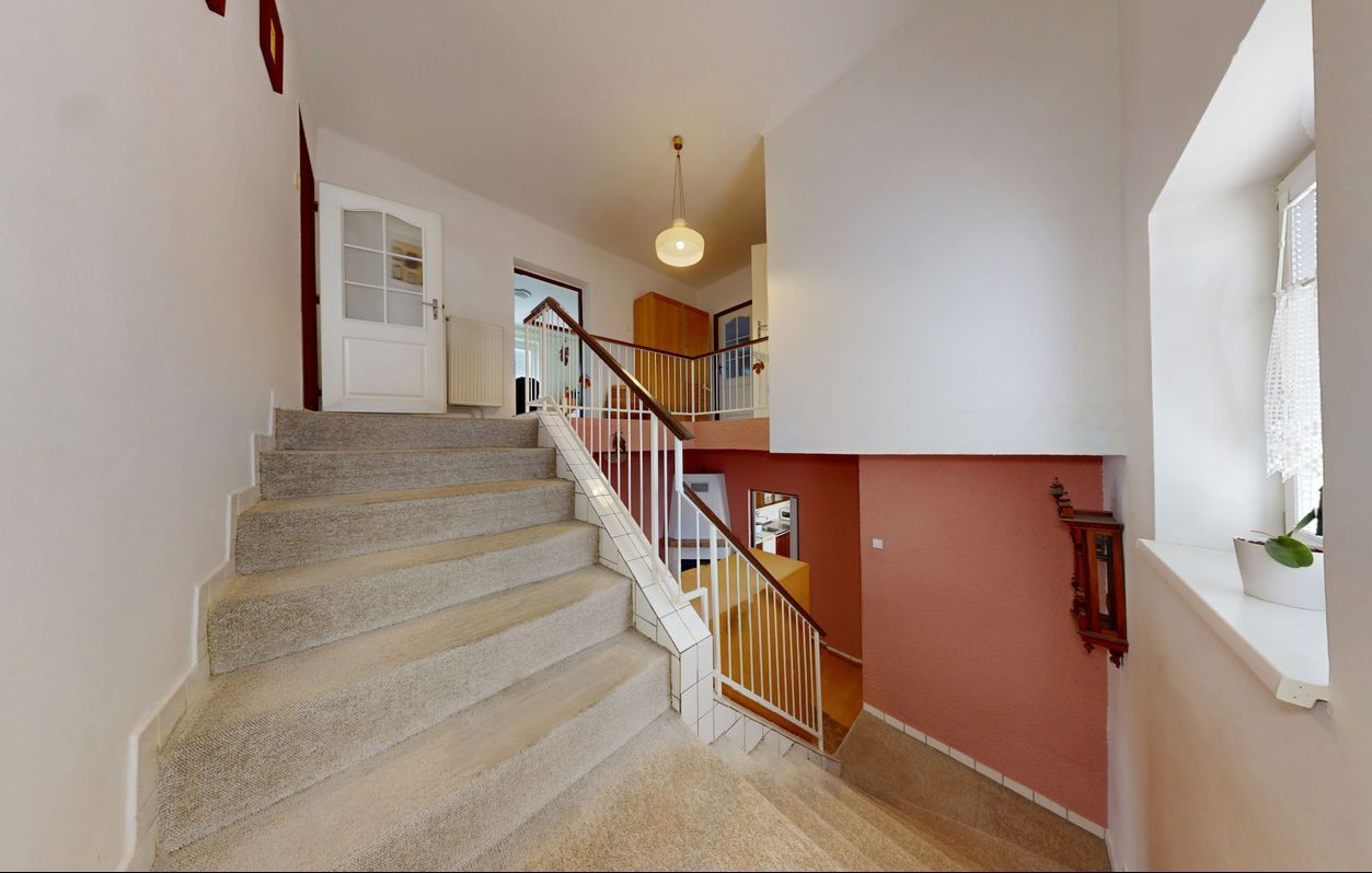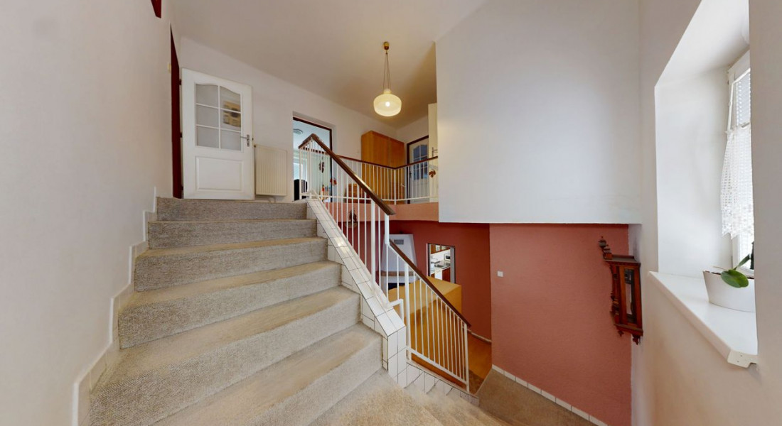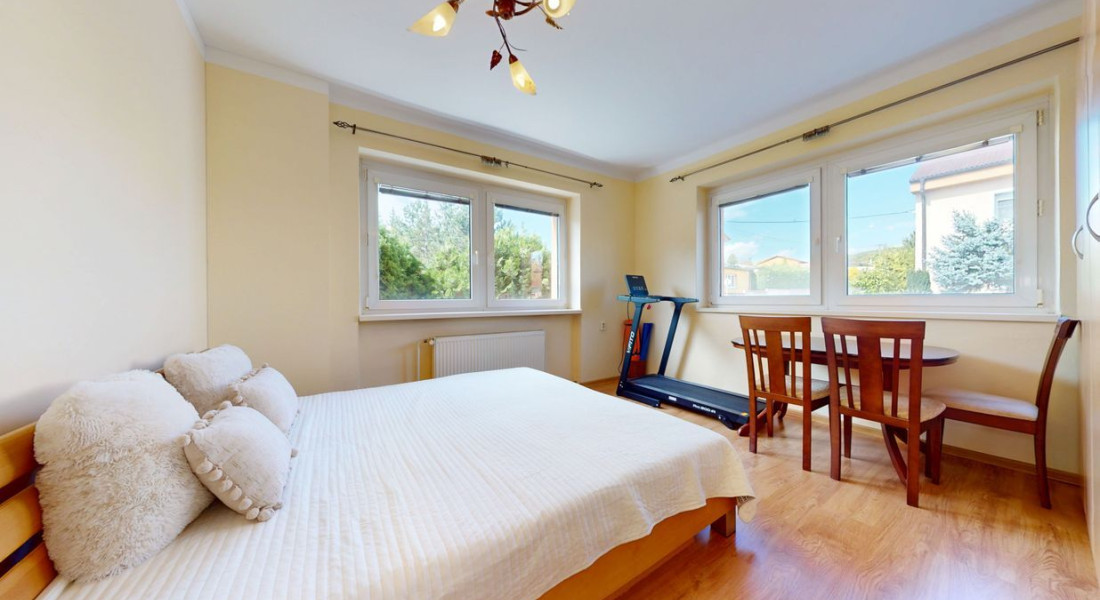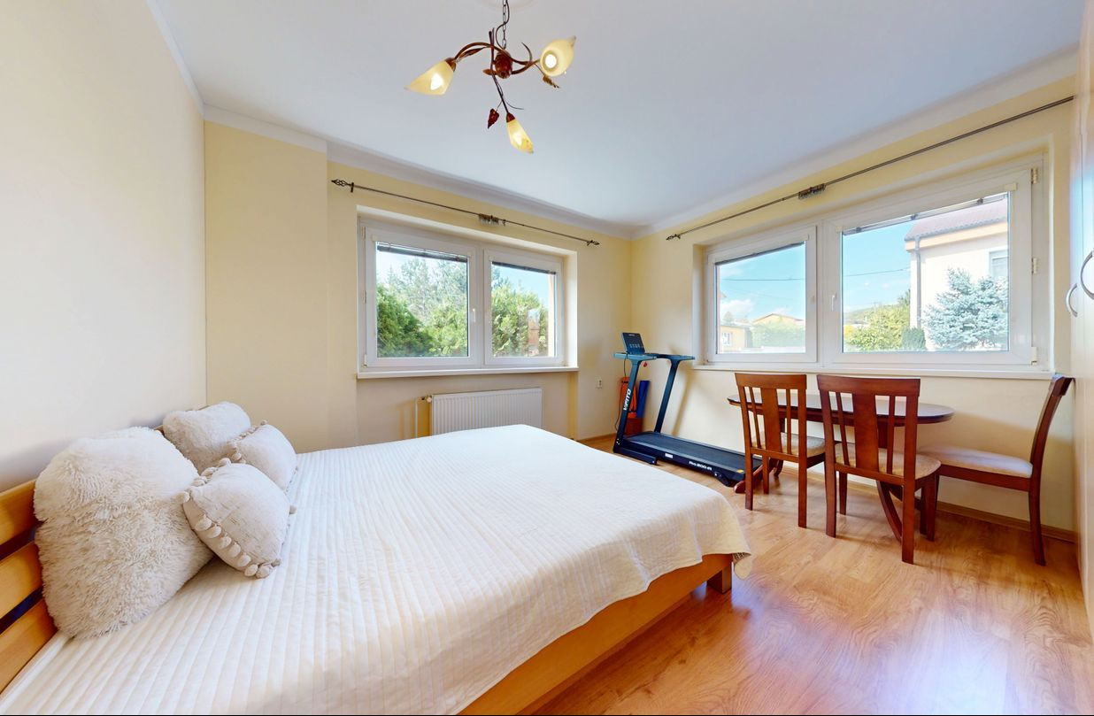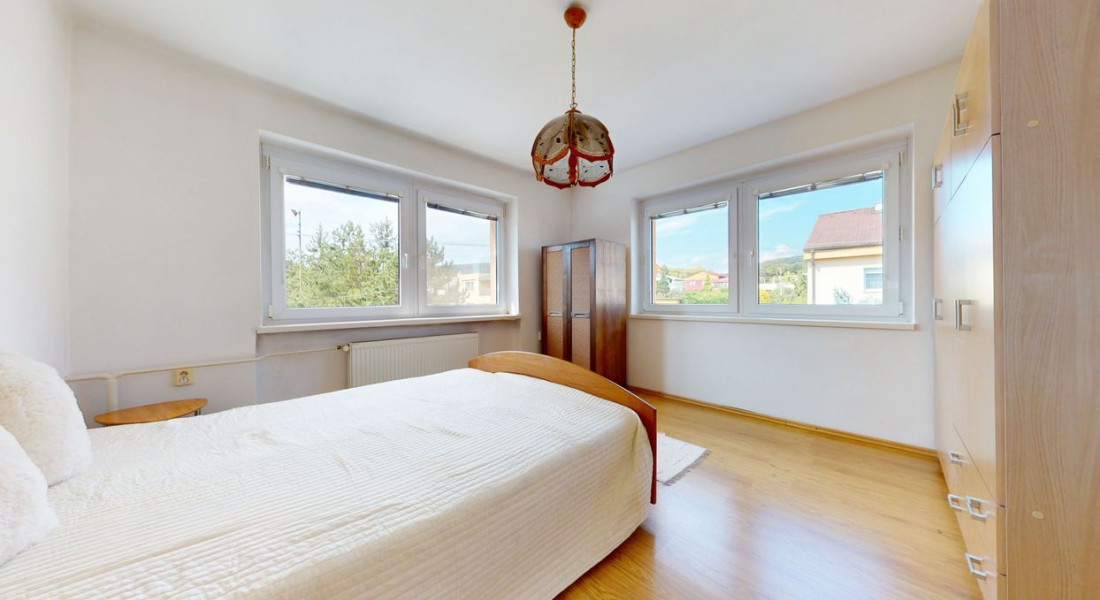 Prvé poschodie: 3 izby, balkón, zimná záhrada, kúpeľňa (umývadlo, vaňa, toaleta).