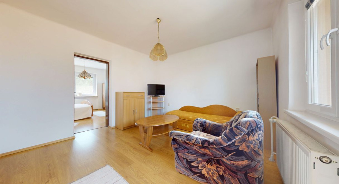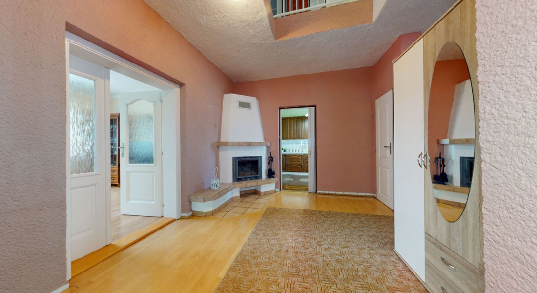 Prízemie: vstupná chodba, kúpeľňa (sprchovací kút, toaleta, umývadlo), hala s krbom, samostatná toaleta, kuchyňa so špajzou, obývacia izba, izba.