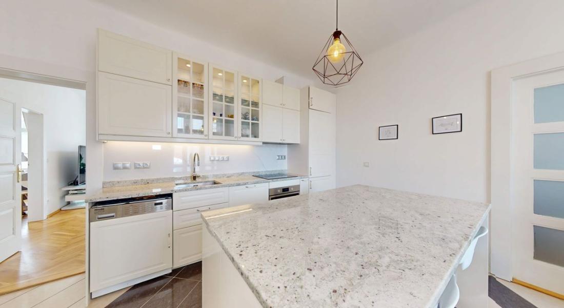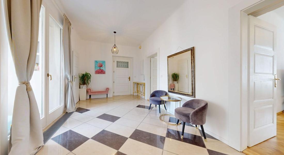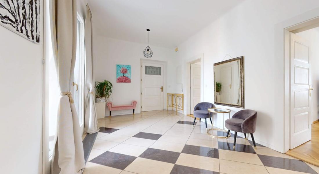 Dispozícia: priestranná obývacia izba, kuchyňa, dve veľké spálne, menšia pracovňa/hosťovská izba (0,5 izby), 2× kúpeľňa, pričom jedna s vaňou a druhá so sprchou a WC, vstupná hala